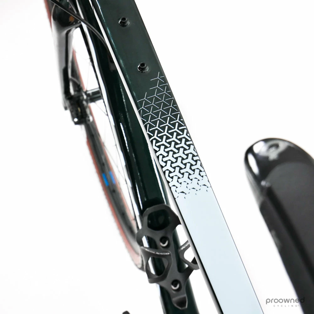 The carbon fibre layup has increased thickness in strategic sections of the tubes providing a durable carbon frame specifically for demanding off-road performance. Protecting features prevents the frame from being damaged by the terrain. Taking the bike from the road and onto the gravel and trails will be a treat for the rider, as the frame reacts and adapts to the terrain. The bike is stable on even the rougher tracks.