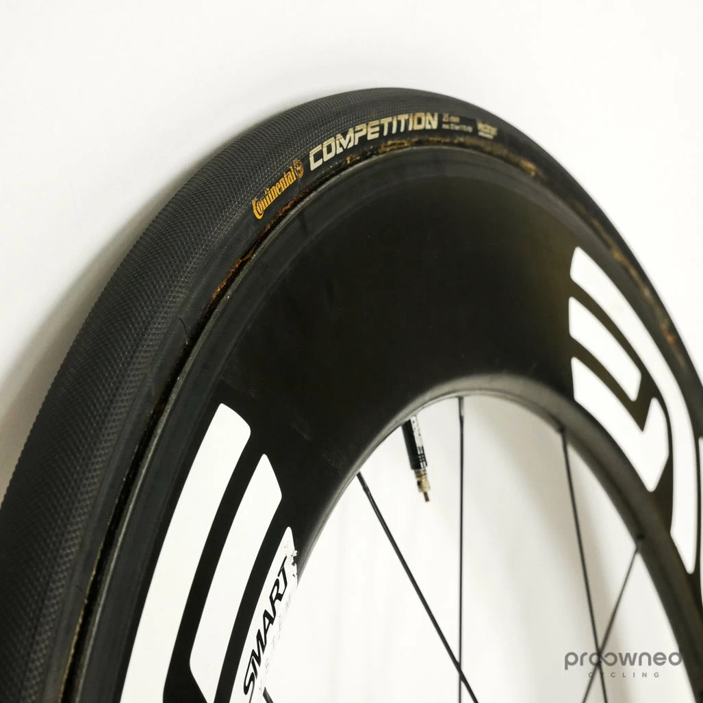 The wheel is equipped with a Continental Competition 25c tubular tire which is used but still in good condition.