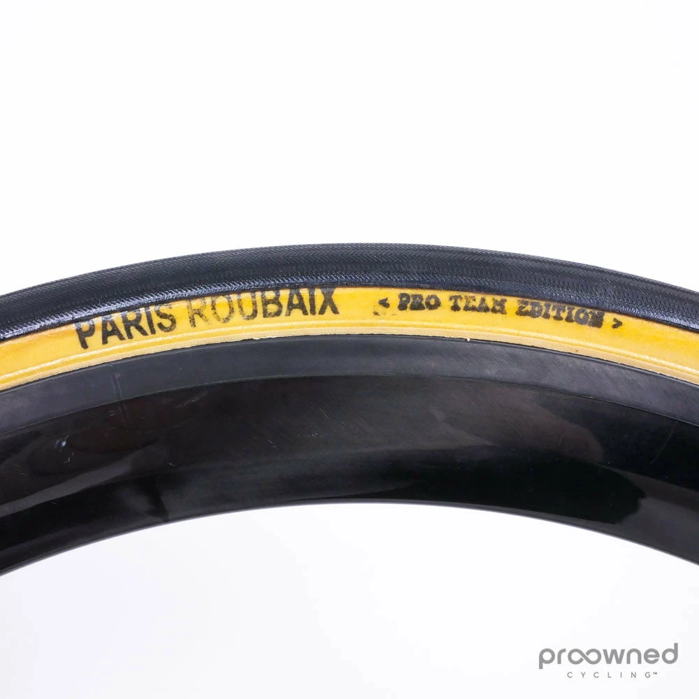 Brand new FMB Paris-Roubaix tubular tire. The Paris-Roubaix tire is made to be the ultimate tire for tough conditions. It is named after the legendary race in the north; the Paris-Roubaix. The flexible casing increases comfort while the tread ensures a good grip on wet and dry paving stones. It features a latex inner tube to lower the rolling resistance and offer better puncture protection.