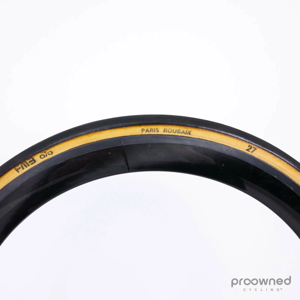 Brand new FMB Paris-Roubaix tubular tire. The Paris-Roubaix tire is made to be the ultimate tire for tough conditions. It is named after the legendary race in the north; the Paris-Roubaix. The flexible casing increases comfort while the tread ensures a good grip on wet and dry paving stones. It features a latex inner tube to lower the rolling resistance and offer better puncture protection.