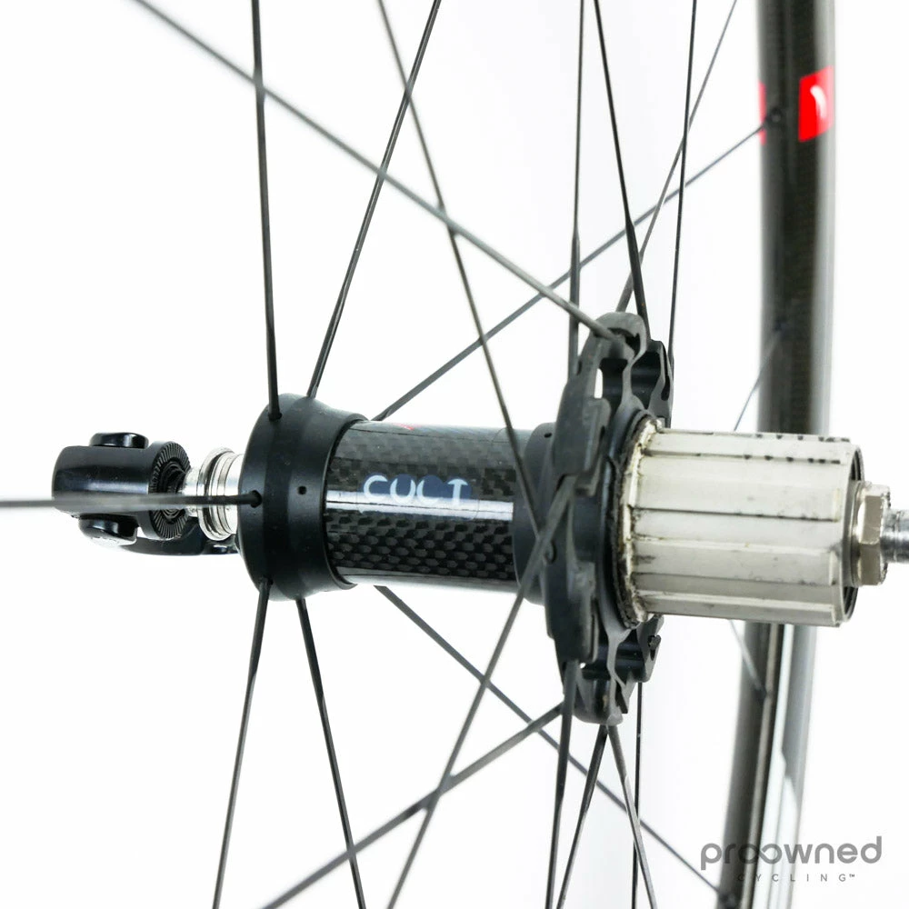 The wheels are equipped with Campagnolo CULT bearings which are the finest ceramic bearings that Campagnolo produces. The bearing has a friction coefficient 40% lower than standard sealed bearings and can spin 5 1/2 times longer.
