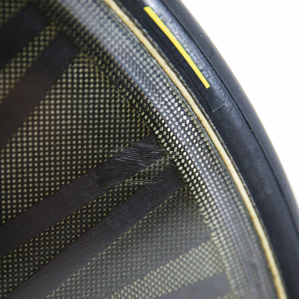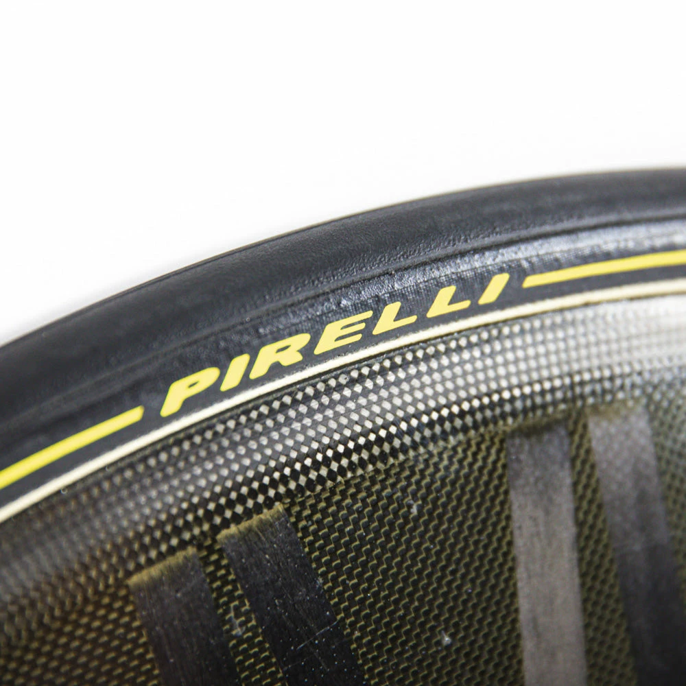This wheel comes with Pirelli P Zero Velo TT tubular tire mounted by the team mechanics. The race-ready lightweight tire is specially designed for time trial and has a completely smooth surface for optimal grip and minimal resistance. The P Zero Velo TT is a prototype tire made for World Tour teams.