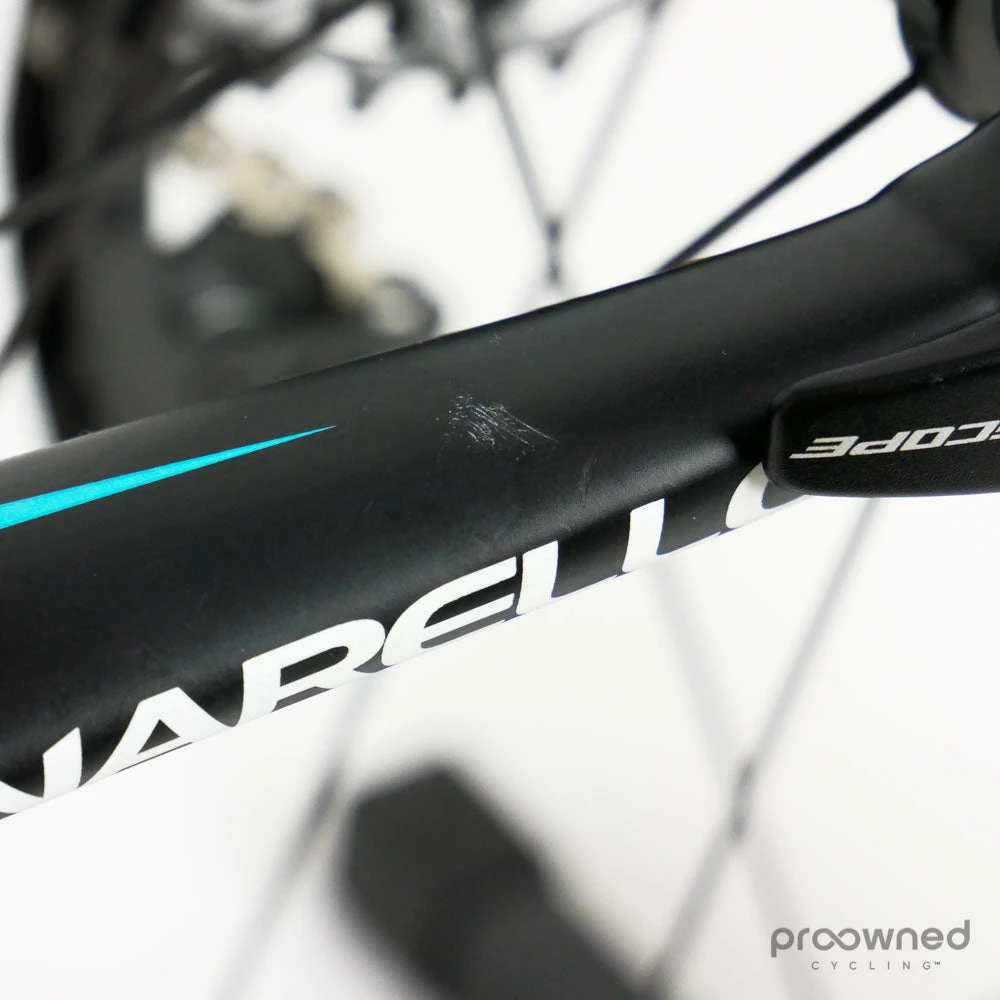 Scratches: Fork, rear stay, chainstay, downtube, stem, steerer, rear derailleur, shifters, and saddle.