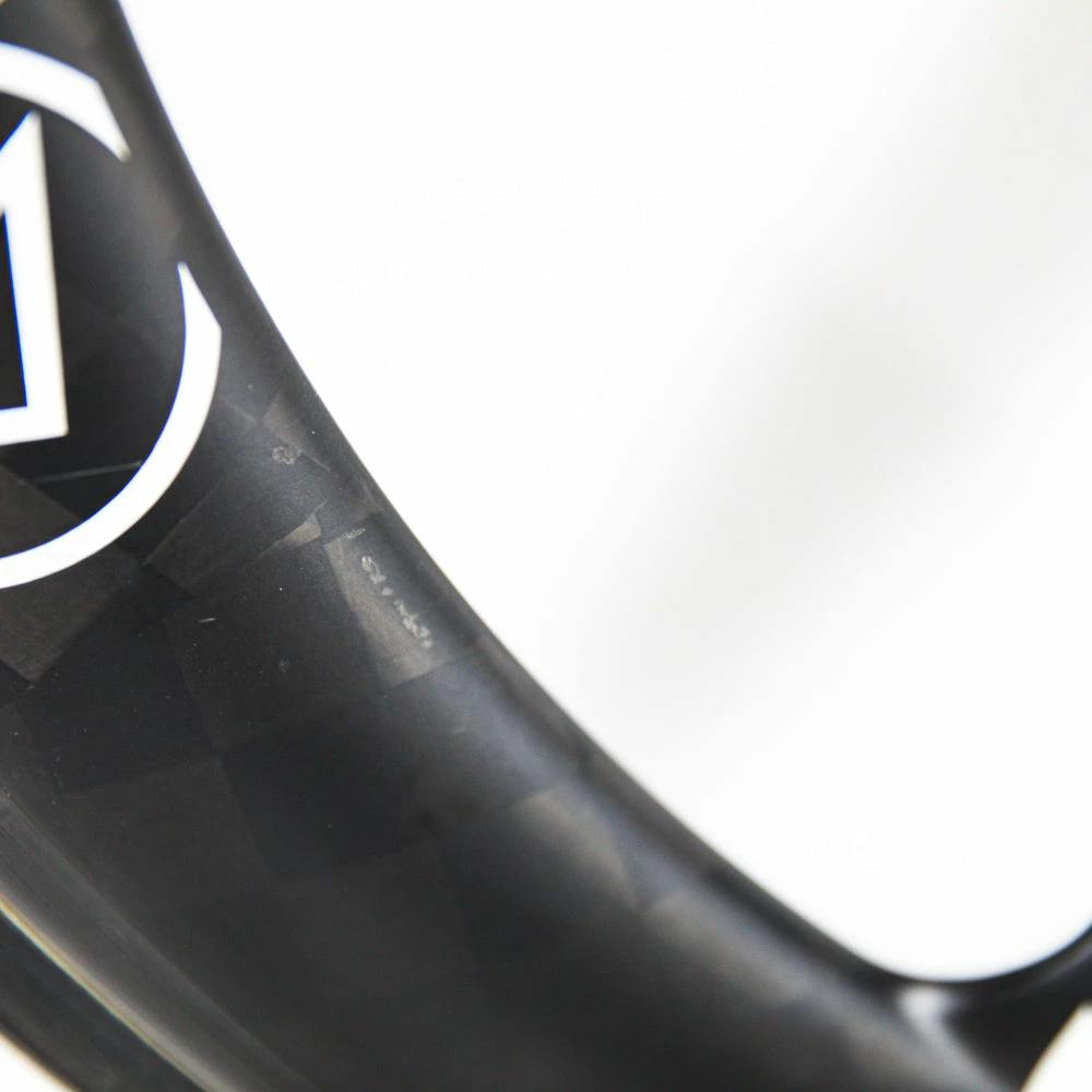 The wheel delivers reliable and smooth performance in varied conditions and can with great advantage be combined with a disc wheel, to complete an incredibly fast time trial machine. The spread tow carbon fibre construction not only looks awesome, but it is also extremely stiff and lightweight, ensuring a very low weight. The design provides minimal drag due to the 3-spoke profile, resulting in a phenomenal performance at high speeds. To prevent interrupting the airflow the valve is positioned behind one of the spokes.
