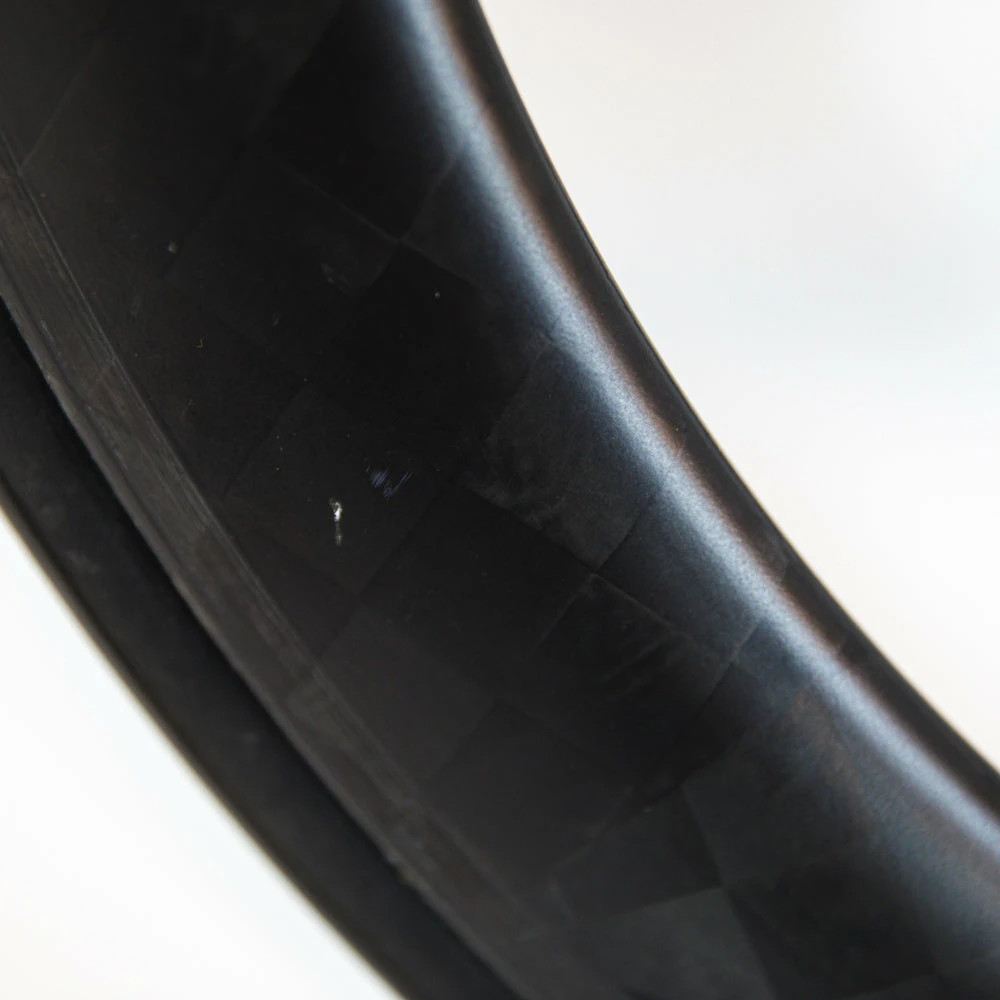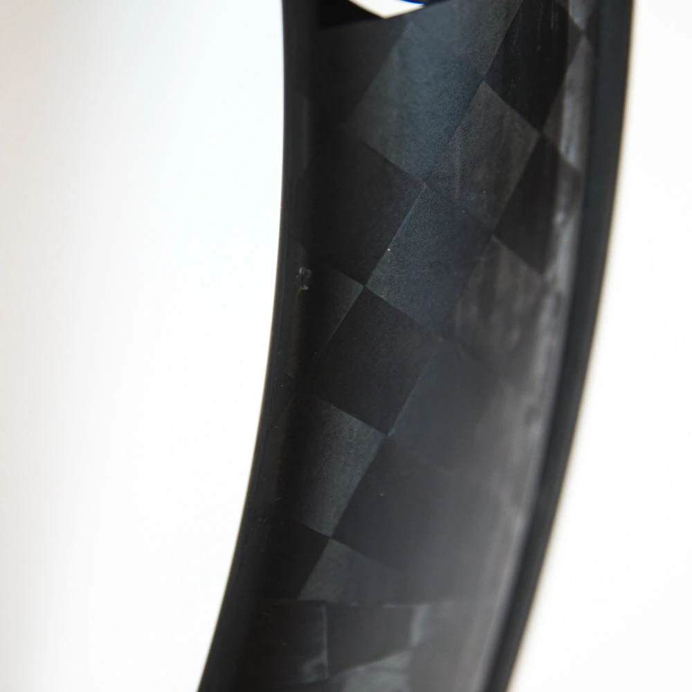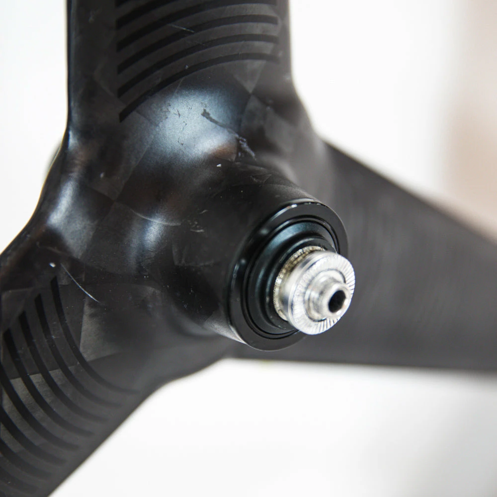 The wheel delivers reliable and smooth performance in varied conditions and can with great advantage be combined with a disc wheel, to complete an incredibly fast time trial machine. The spread tow carbon fibre construction not only looks awesome, but it is also extremely stiff and lightweight, ensuring a very low weight. The design provides minimal drag due to the 3-spoke profile, resulting in a phenomenal performance at high speeds. To prevent interrupting the airflow the valve is positioned behind one of the spokes.