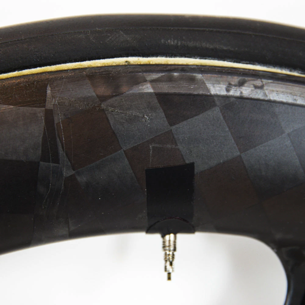 This wheel comes with a Pirelli P Zero Velo TT tubular tire mounted by the team mechanics. The race-ready lightweight tire is specially designed for time trial and has a completely smooth surface for optimal grip and minimal resistance. The P Zero Velo TT is a prototype tire made for World Tour teams.