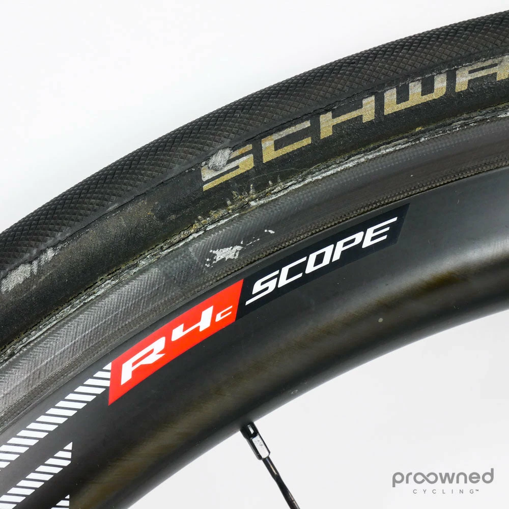The R4C wheelset is built with a 45mm rim depth making it a perfect all-around wheelset that is deep enough to get the aerodynamic benefits of a deep rim yet low enough to be steady in windy conditions. With an approximate weight of 1375g a pair (without tires) the wheels are also a good companion going uphill.