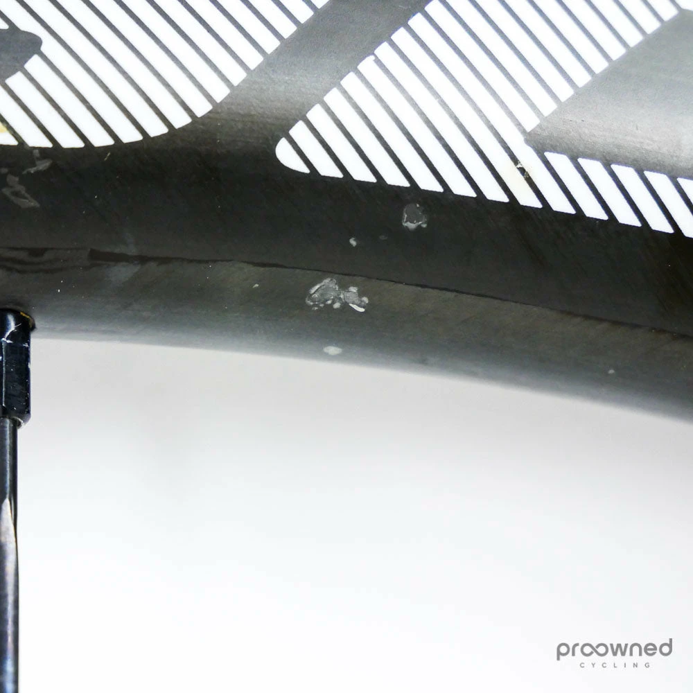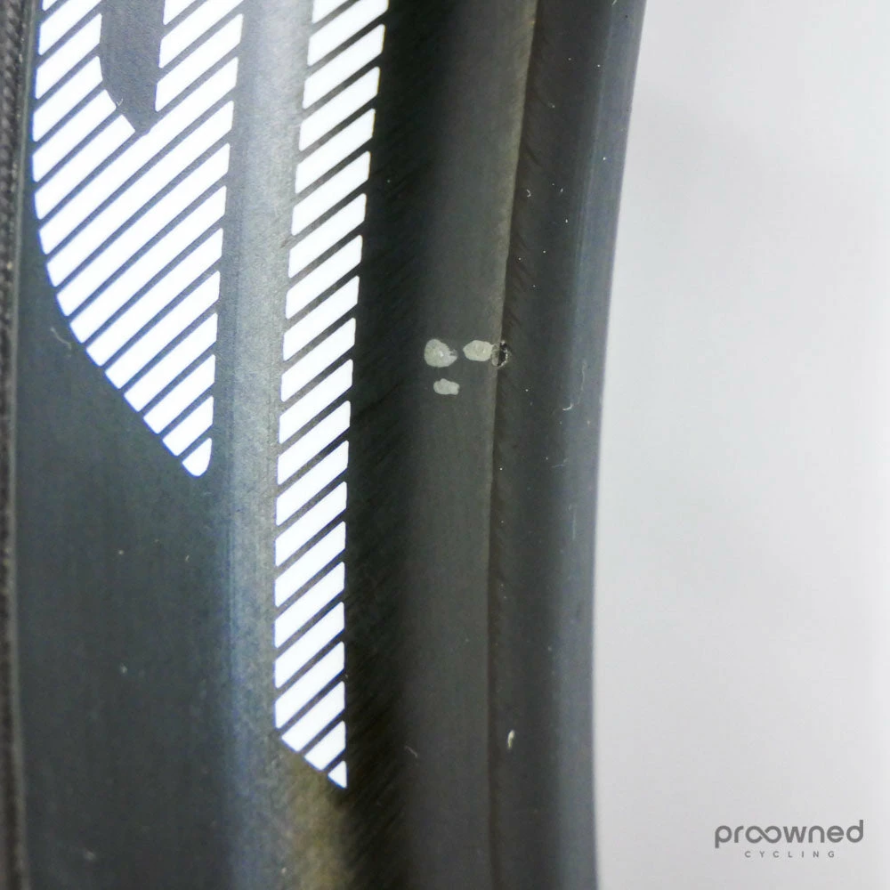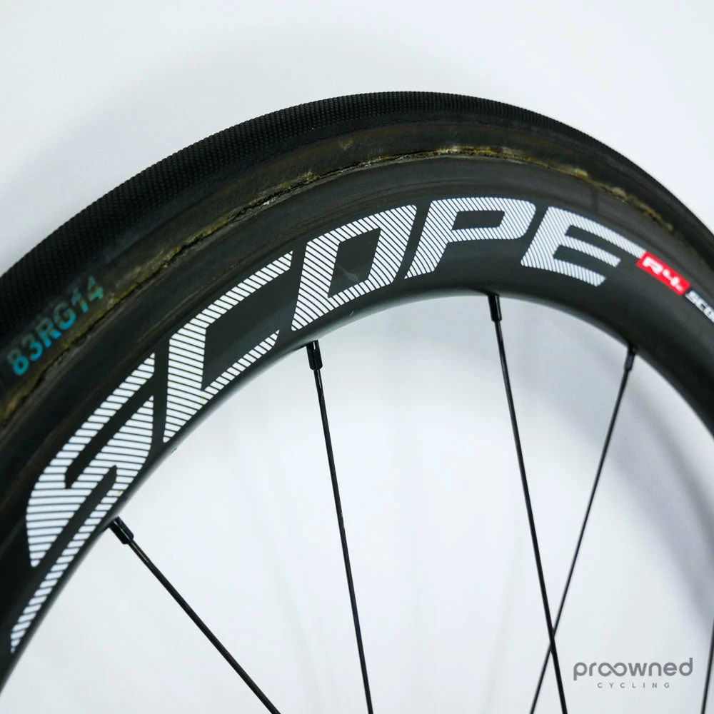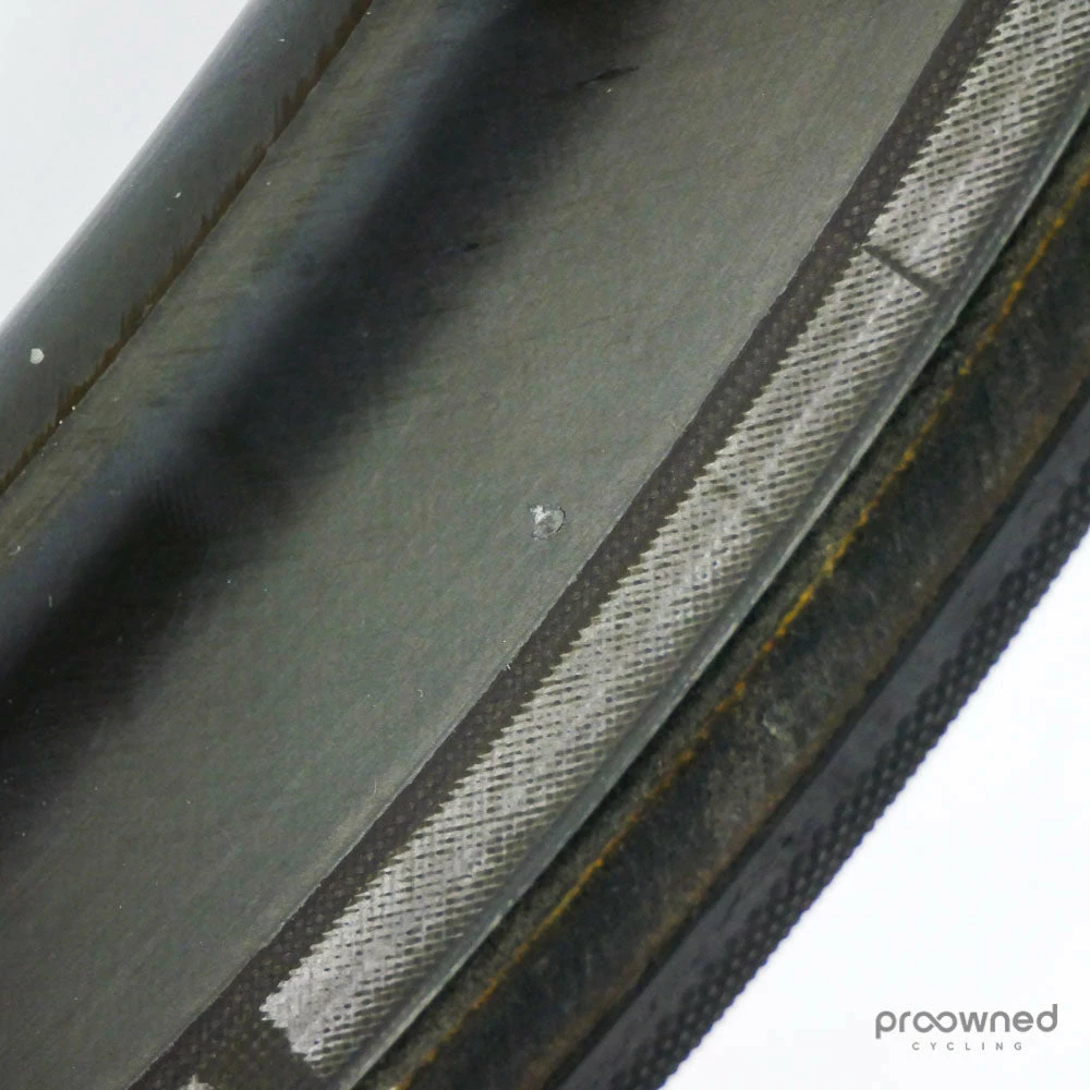 The wheel is sold with a pre-installed Schwalbe Pro One HT 25mm tubular tire. The tire is used but is in very good condition.