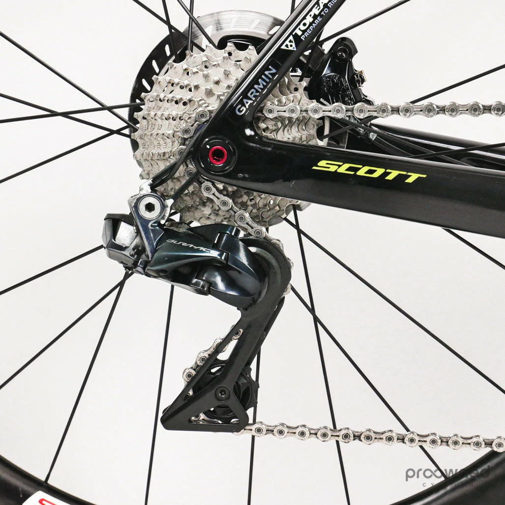 The team mechanics have well maintained this bike, and our Mechanic has furthermore restored it. It is equipped with the top-of-the-line electronic Dura-Ace 9170 2×11 speed Disc groupset by Shimano.