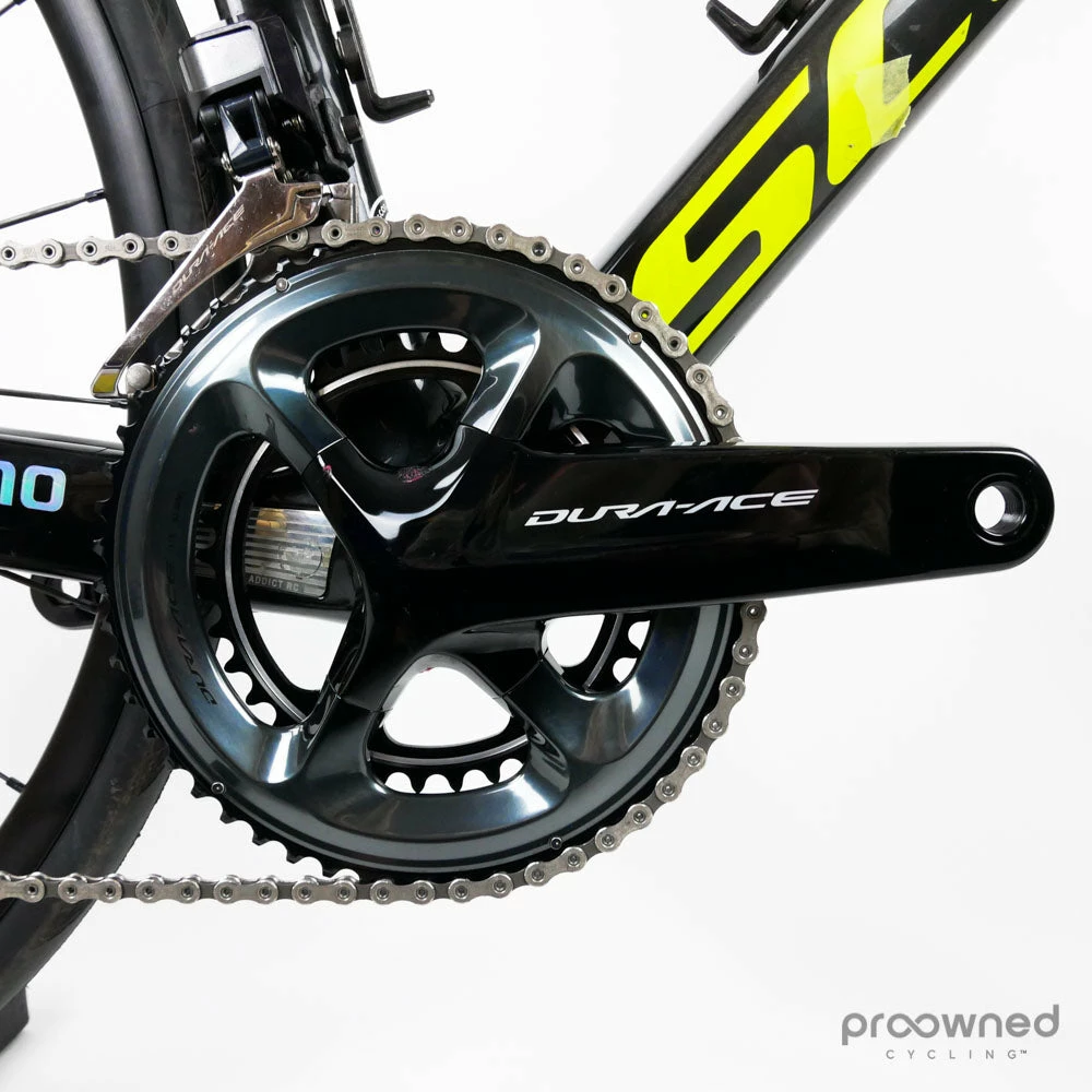 The team mechanics have well maintained this bike, and our Mechanic has furthermore restored it. It is equipped with the top-of-the-line electronic Dura-Ace 9170 2×11 speed Disc groupset by Shimano.