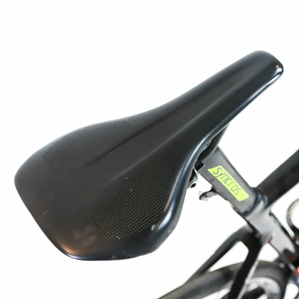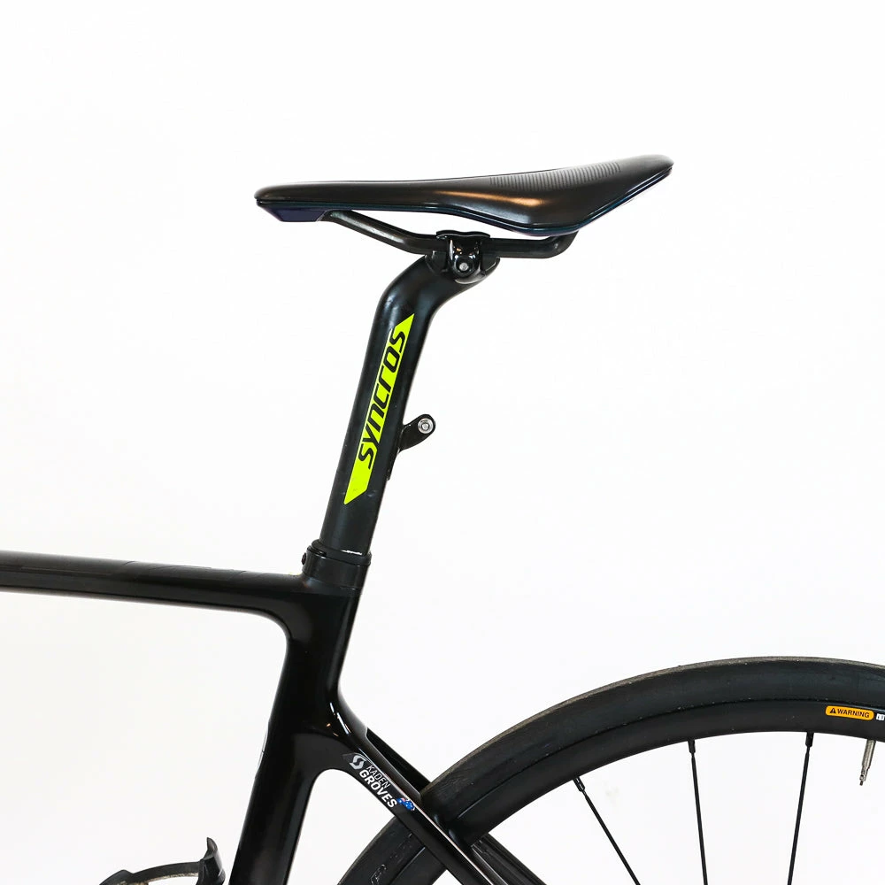 The bike frame is in Very good condition and some components are brand new and some are used – please see the details below. The bike is built with a Shimano Di2 groupset, team-specific Syncros components, and a Shimano disc wheelset.