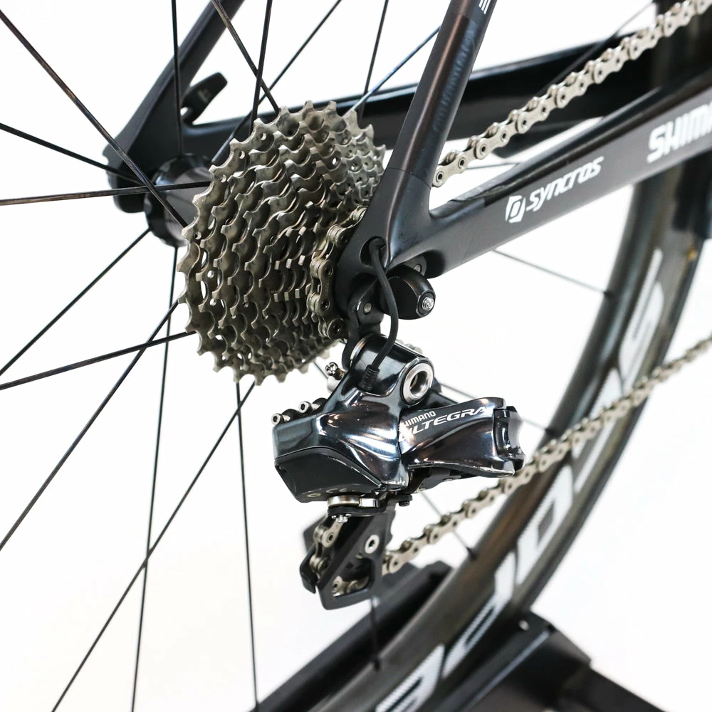 The bike frame is as new and some components are used – please the details below. The bike is built with a Shimano Di2 groupset, team-specific Syncros components, and a Scope R4C carbon wheelset.