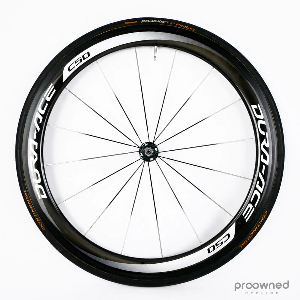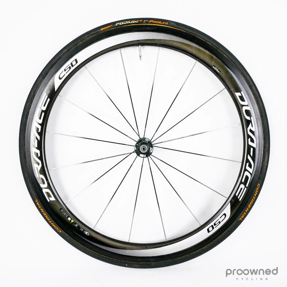 Shimano Dura-Ace C50 carbon tubular front wheel.
